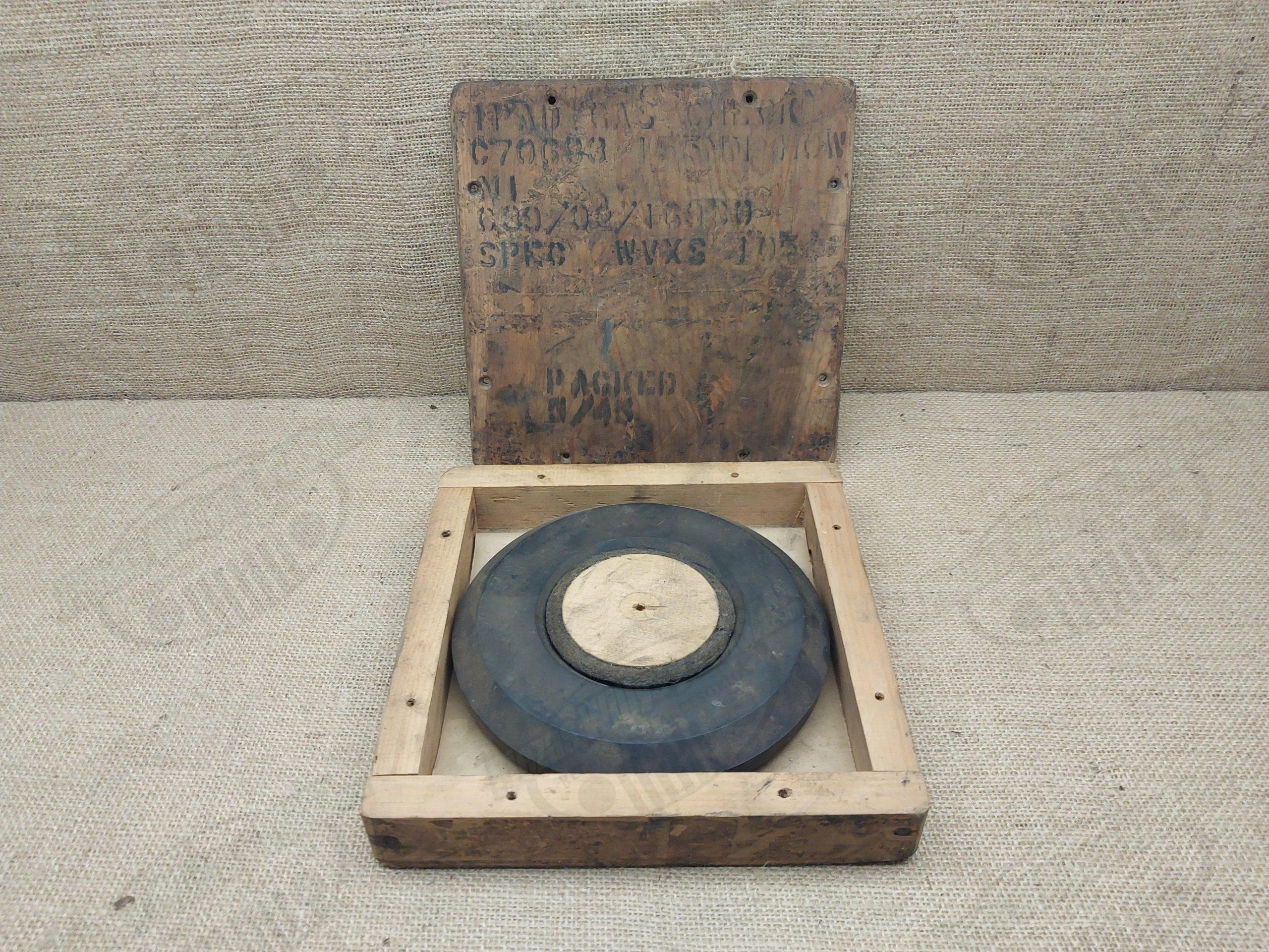 galleta plastica de pieza de artilleria, se trata de un repuesto original muy antiguo, de una pieza de artilleria, en su caja de madera original.