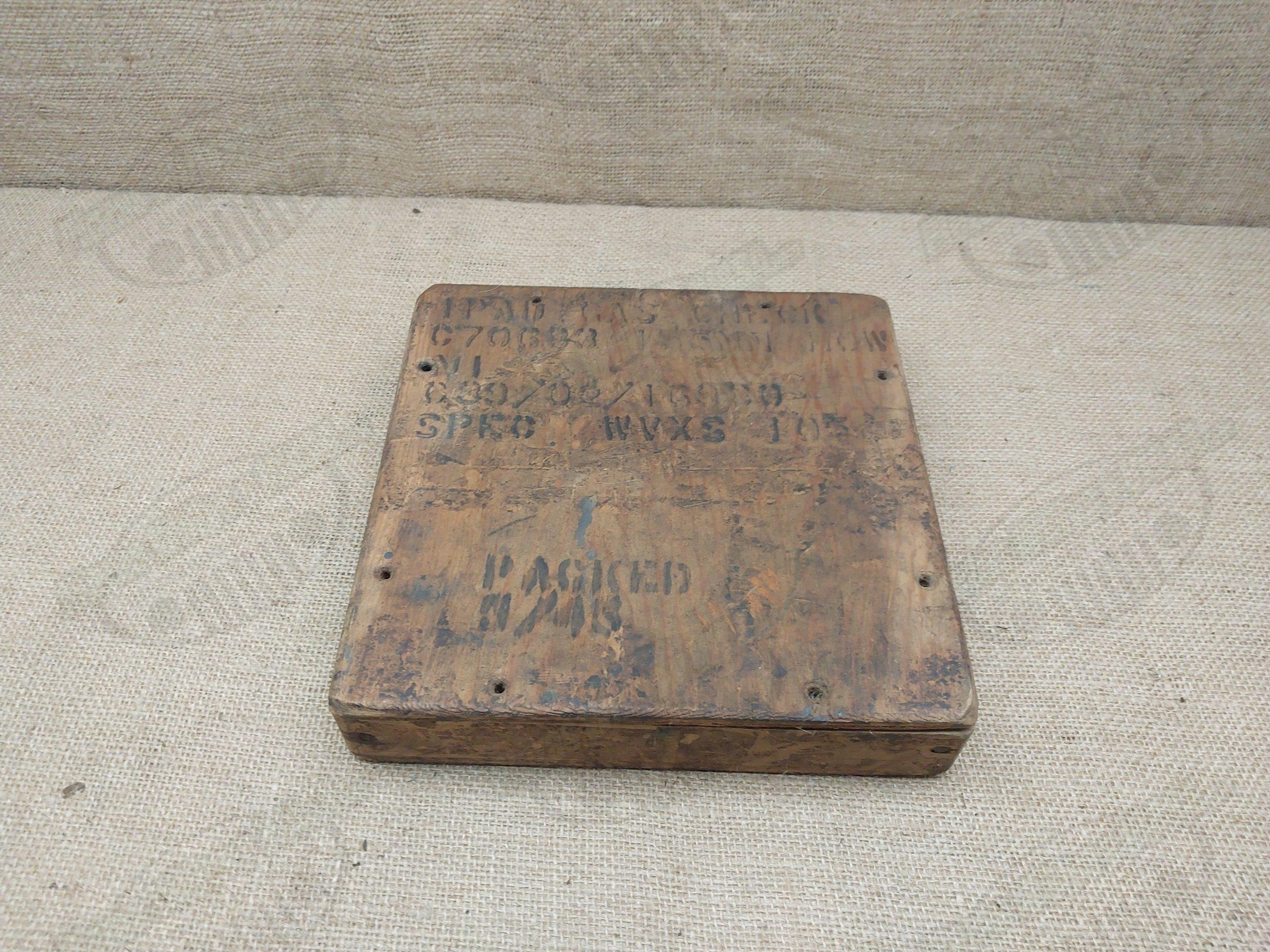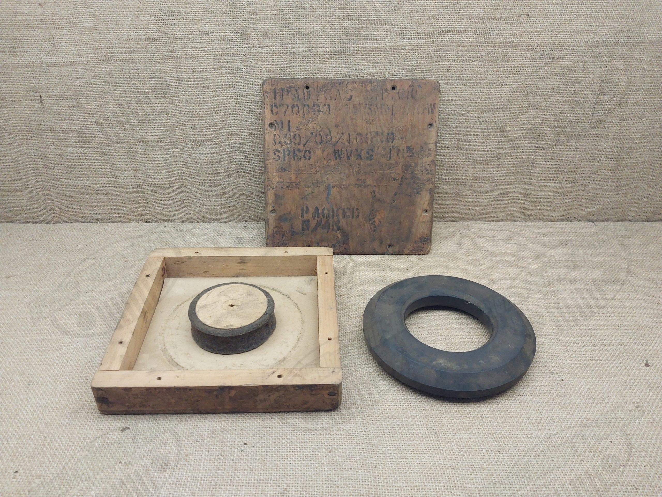 galleta plastica de pieza de artilleria, se trata de un repuesto original muy antiguo, de una pieza de artilleria, en su caja de madera original.